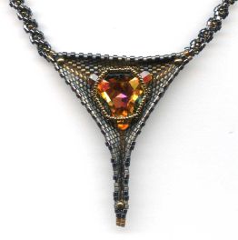 Triangle Trek Necklace by Doris Coghill A three dimensional triangle pendant done with size 10 Delica beads is accented with a 23mm Swarovski Triangle and finished with a Ndebele spiral necklace using Size 10 Delica's and size 15 seed beads. Quantity Kit $58.00 Quantity Pattern $12.00 |