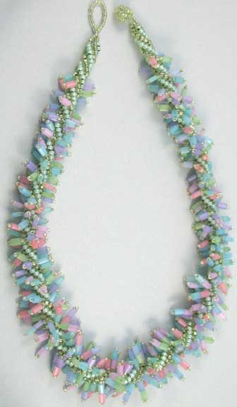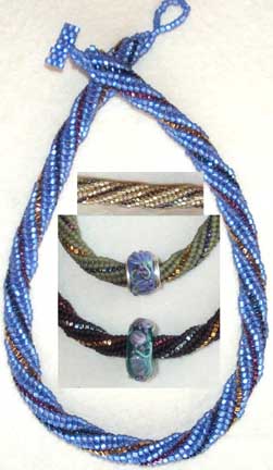 This attractive spiral necklace is perfect for showing off your favorite large hole lampwork or PMC beads. This necklace should be easy to complete by all levels of beaders. The lampwork beads pictured are by Lea