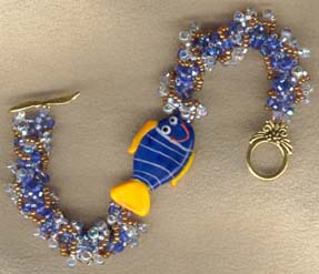 by Doris Coghill This smiling fish will cheer you every time you wear it. The bracelet is constructed with a netting stitch that should be easy to complete by any level of beader. Comes with a lampworke fish from the Czech Republic. Pattern $5.00 Quantity |