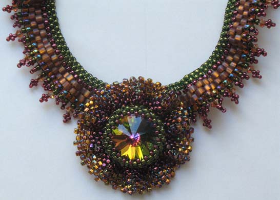 Start with an 18 mm Swarovski stone surrounded with ruffled peyote and more Swarovski Crystals. The necklace has a slight ruffle to it and is also embellished with Swarovski. Quantity Kit $59.00 |