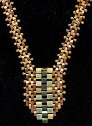 Triangle Trek Necklace by Doris Coghill A three dimensional triangle pendant done with size 10 Delica beads is accented with a 23mm Swarovski Triangle and finished with a Ndebele spiral necklace using Size 10 Delica's and size 15 seed beads. Quantity Kit $58.00 Quantity Pattern $12.00 |